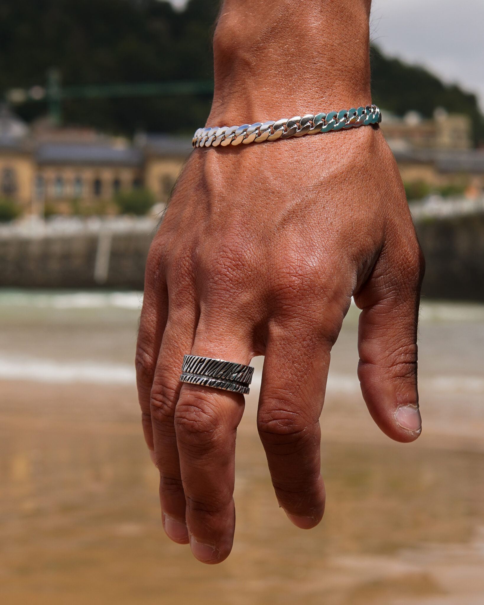 Propósito del anillo: Un anillo diseñado para atraer a hombres que buscan una conexión simbólica con la naturaleza sin sacrificar el estilo moderno. La textura es tributo a la fuerza y longevidad de los árboles y alude a la resistencia y capacidad de crecimiento personal.